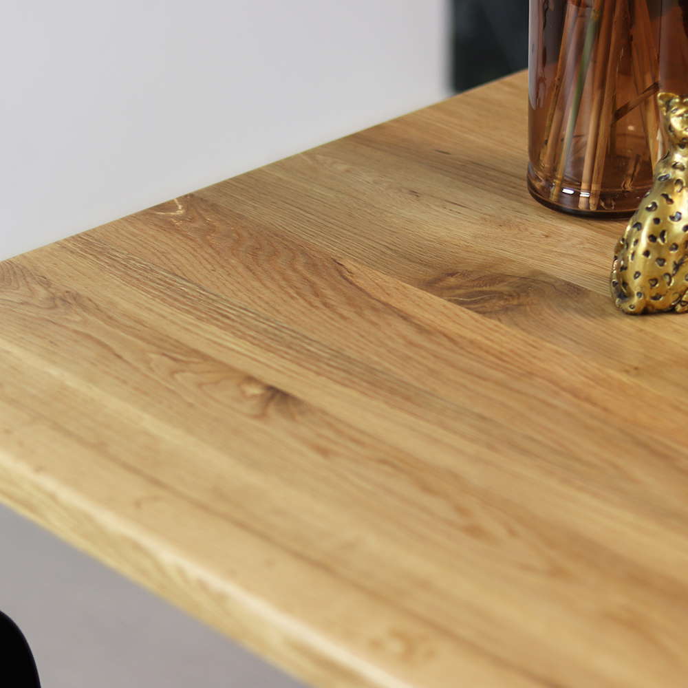 Het tafelblad van 80 x 80 cm is gemaakt van massief eikenhout. Eikenhout is een enorm sterk houtsoort wat jarenlang mee gaat. De tafel is vooraf behandeld met een blanke lak. Dit maakt dat de tafel direct klaar is voor gebruik. Wel adviseren wij de tafel voor extra bescherming te behandelen met onze hout care kit. Daarnaast is het tafelblad opgedikt, wat inhoudt dat er aan de zijkanten (onder het blad) een rand is aangebracht van 2 cm waardoor het blad aan de rand 4 cm is en he binnenste gedeelte 2 cm massief is. Dit zorgt voor meer stevigheid.
