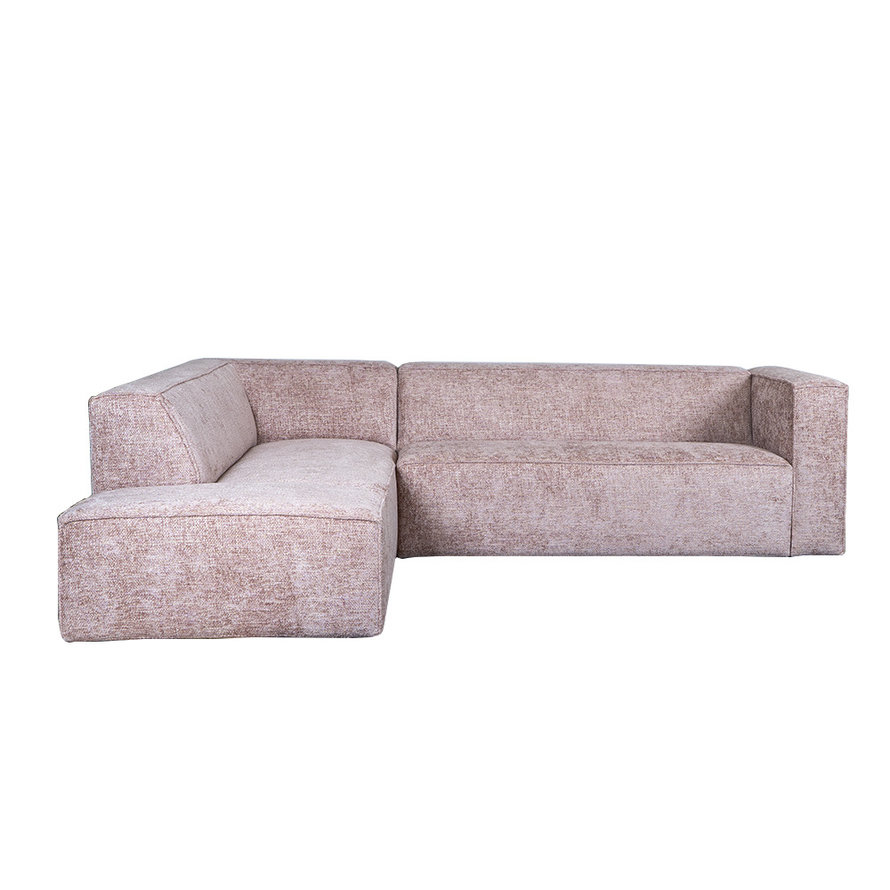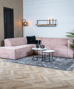 De bank Memphis is verkrijgbaar in een hoekbank links of rechts in de kleuren roze, zwart, okergeel en taupe.