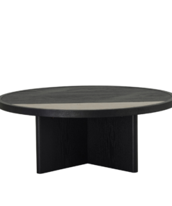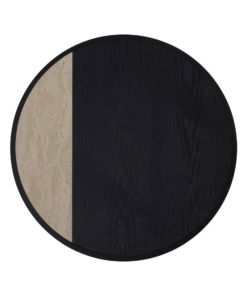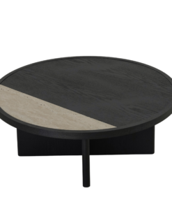 Salontafel Maeva is een stijlvol middelpunt voor elke kamer. Met haar ronde vorm van Ø80 cm en het opvallende contrast tussen zwart eikenhout en een ingelegd travertin deel, brengt Maeva een perfecte balans tussen elegantie en natuurlijke materialen.