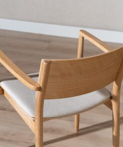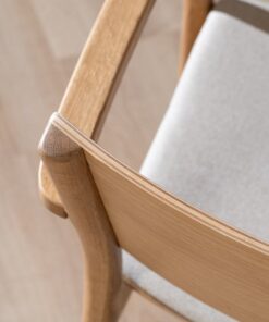 Stoel Juan in naturel eiken brengt eenvoud en warmte samen. Juan heeft een minimalistisch design en de strakke lijnen maken de stoel eenvoudig en toch uitnodigend. De zitting heeft een gestoffeerd kussen van linnen stof met een off white kleur wat gemakkelijk te combineren is met omgevingskleuren.