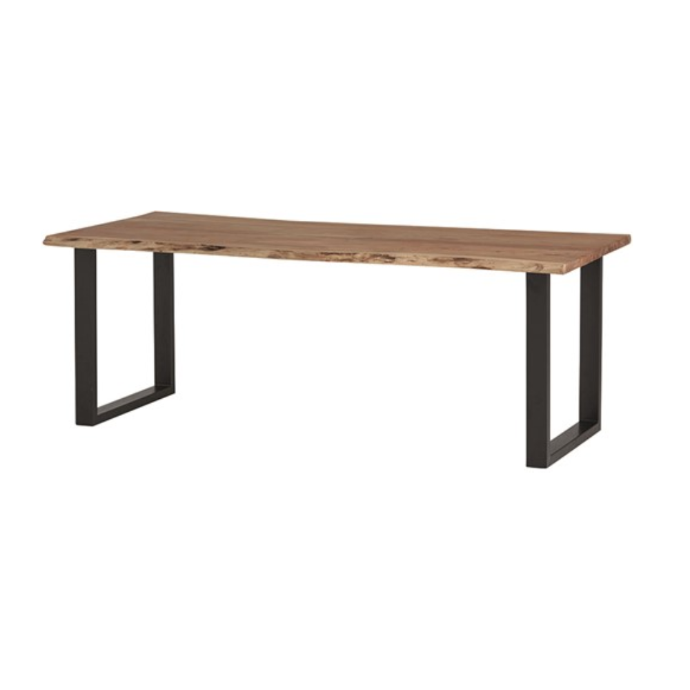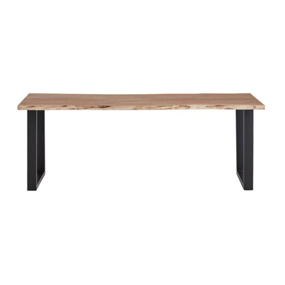 Bij deze industriële boomstamtafels hebben de bladen haar natuurlijke uitstraling behouden, hierdoor is iedere tafel uniek. De lange zijden zijn echt organisch van vorm, dus onregelmatig. Het blad is gemaakt van circa 40 mm. vol massief acaciahout en het U-vormige onderstel is gemaakt van metaal met een zwarte poedercoating. De poten zijn op twee verschillende plekken te monteren, hier kunt u zelf de gewenste afstand tussen beide poten bepalen.