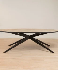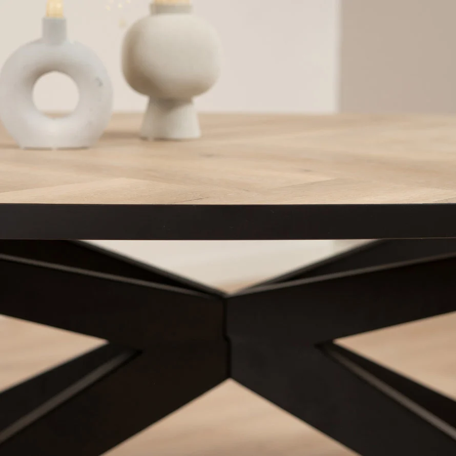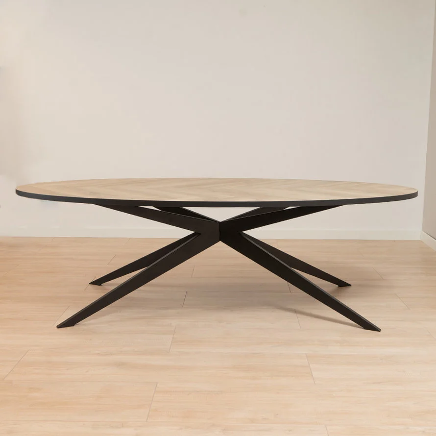 Eettafel visgraat ovaal Ilva heeft een gepoedercoat, metalen spinpoot als onderstel. Het onderstel zorgt voor veel stabiliteit waardoor de tafel stevig op zijn poten staat. Het onderstel heeft wat dikkere balken wat voor een robuustere uitstraling zorgt. De totale hoogte van de tafel is 74 centimeter. De hoogte tot aan de onderkant van het tafelblad is 71 centimeter.